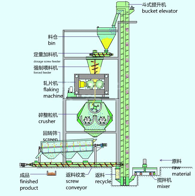 项目概述:DH系列干法辊压造粒机是采用干法挤压工艺技术,对含水量<2%的粉状物进行压缩成片,再经过破碎、整粒、筛分工艺,使片块状物料变成符合使用要求的颗粒状物料。